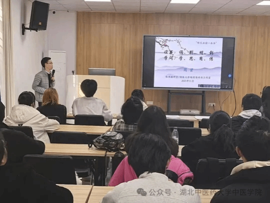 在先导环节,作为名老中医传承工作的参与者,周贤老师分享了对《名老中医之路》的深刻见解,用幽默风趣的语言和生动的示例向同学们讲解了读书须得诵、别、明、彰,学问须得学、思、用、传,并向同学们提出了许多实用性的建议。